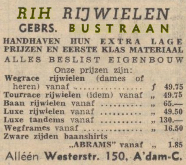 On the other hand, they were not selling a “typical Dutch bicycle.” By this time they were known for building lightweight, high-performance frames tailored to the exact needs of individual professional cyclists (“eerste klas materiaal…alles beslist eigenbouw”). A niche market, but a very small one. RIH faced a considerable headwind selling many premium bicycles during the protracted economic crisis.