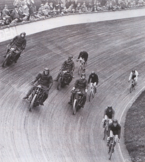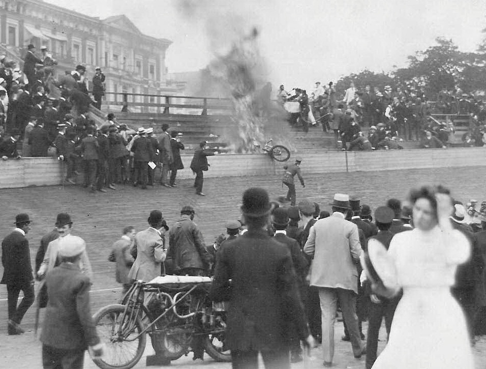 The noisy petrol powered pacers were the big crowd lure. Engine oil leaked onto the track. Crashes were common as the bicycle and motorcycle tires of the day would often fail or slide on the slick track. For years no one wore a helmet. It was perilous for spectators as well. A 1909 crash at Berlin’s Botanical Garden track killed six people and injured 40 others. The packed wooden grandstand caught fire after the motor pacer veered into the crowd.