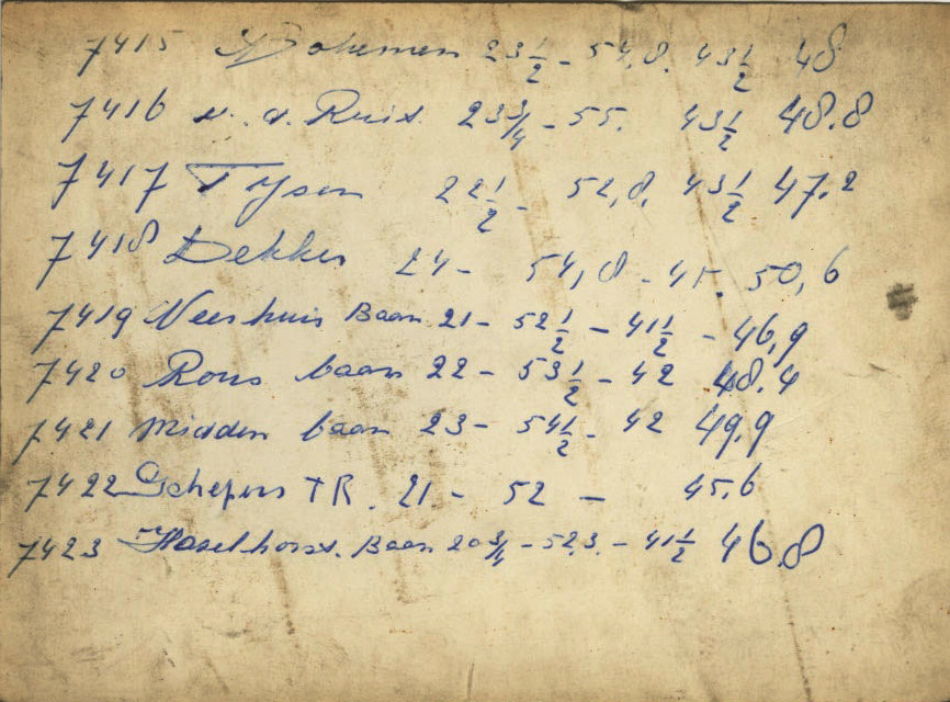 Upon examination the cards appear to be production records kept by Wim Bustraan Jr. He assumed ownership following his father’s 1955 death. They all have the same handwriting. There is a dramatic production decline once the business passed to van der Kaaij.